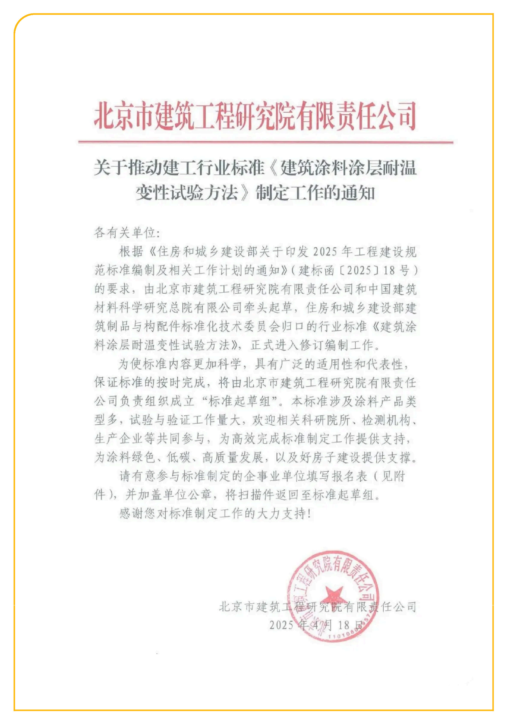 Welcome relevant research institutes, testing institutions, and production enterprises to participate together and provide support for the efficient completion of standard setting work, the green, low-carbon, and high-quality development of the coating industry, and the construction of good houses.